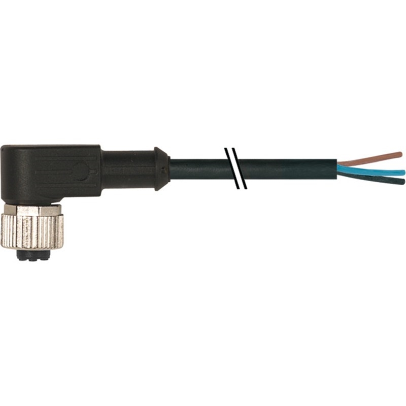 Connecteur / Câble de raccordement; Type: Câble de connexion, M12 x 1, surmoulé; Type de signal: Câble de connexion pour capteurs/actionneurs; Raccordement A: Connecteur M12, femelle, coudé, 3 pôles, codé-A; Raccordement B: Extrémité de câble libre; Câble: 5.00 m, PUR, sans halogène,, 3 fils (3 x 0.34 mm²), noir; Blindage: Non blindé; Compatible chaînes porte-câbles: Oui (10 Mio.), 10 m/s²; Matériau, connecteur: PUR, noir; Matériau verrouillage: Zinc moulé sous pression, nickeIé mat; Tension de service: max. 250 V AC/DC; Tension de service (Listé UL): 30 V AC/DC; Courant de service par contact: max. 4 A; Degré de protection: IP65, IP66K, IP67 (EN 60529); Plage de températures: -25...+80 °C; Plage de températures (câble, fixe): -40...+80 °C; Plage de températures (câble, mobile): -25...+80 °C