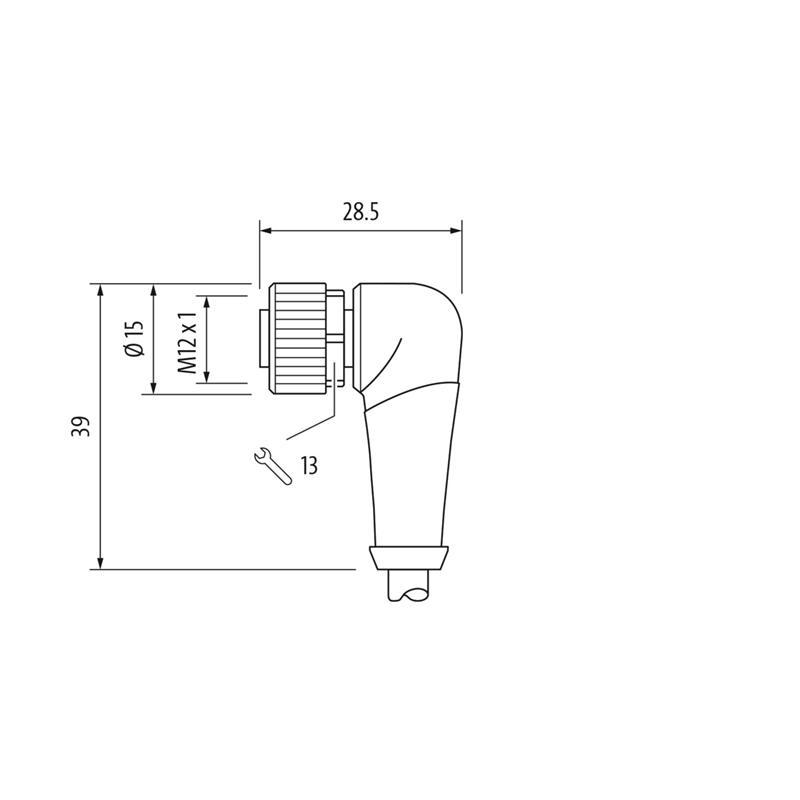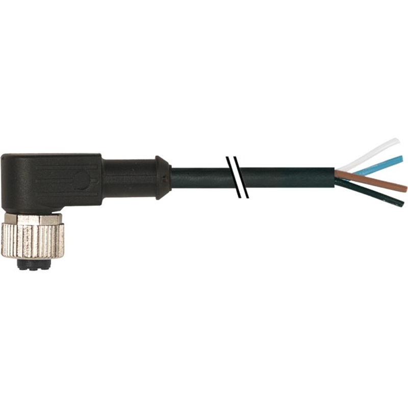 Connecteur / Câble de raccordement; Type: Câble de connexion, M12 x 1; Type de signal: Capteur / Actionneur; Raccordement A: Connecteur M12, femelle, coudé, 4 pôles; Raccordement B: Extrémité de câble libre; Câble: 2.00 m, PUR sans halogène, 4 fils (4 x 0,34 mm²), noir; Blindage: Non blindé; Compatible chaînes porte-câbles: Oui; Adapté à la robotique: ± 180 °/m; Matériau de l'écrou-raccord: Zinc moulé sous pression; Tension de service: max. 250 V AC/DC; Tension de service (UL listed): 30 V CA/DC; Courant nominal: 4 A; Indice de protection: IP65, IP66K, IP67; Plage de température (mobile): - 25 ... + 80 °C; Plage de température (fixe): - 25 ... + 80 °C; Plage de température (câble fixe): - 40 ... + 80 °C