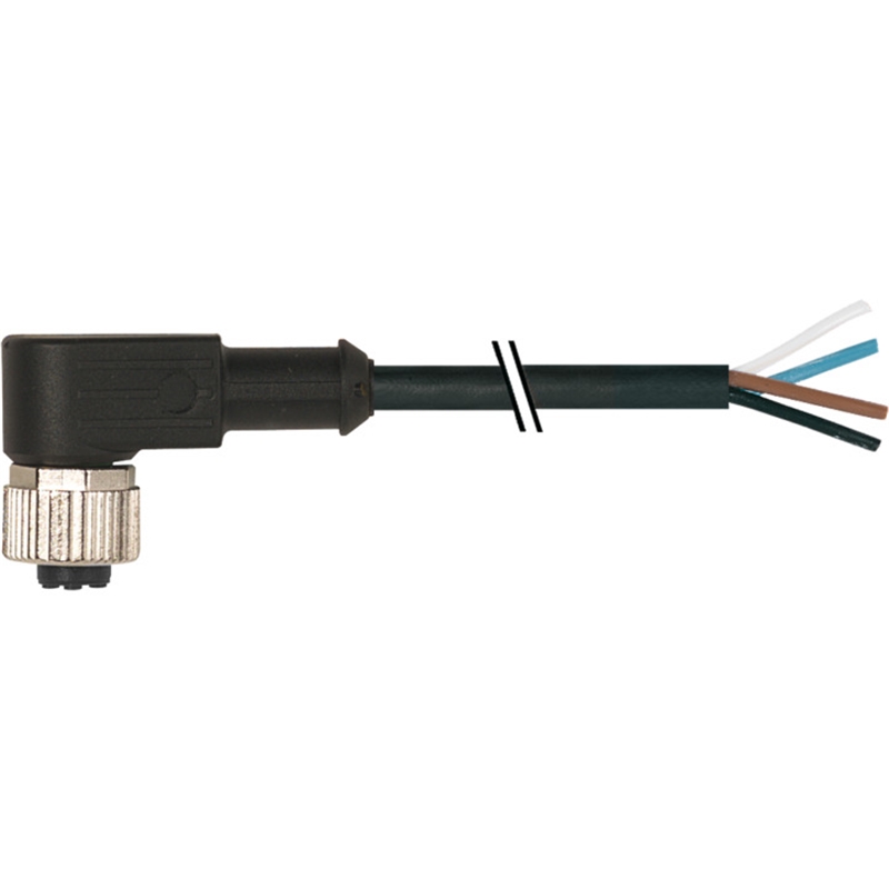 Connecteur / Câble de raccordement; Type: Câble de connexion, M12 x 1; Type de signal: Capteur / Actionneur; Raccordement A: Connecteur M12, femelle, coudé, 4 pôles; Raccordement B: Extrémité de câble libre; Câble: 5.00 m, PUR sans halogène, 4 fils (4 x 0,34 mm²), noir; Blindage: Non blindé; Compatible chaînes porte-câbles: Oui; Adapté à la robotique: ± 180 °/m; Matériau de l'écrou-raccord: Zinc moulé sous pression; Tension de service: max. 250 V AC/DC; Tension de service (UL listed): 30 V CA/DC; Courant nominal: 4 A; Indice de protection: IP65, IP66K, IP67; Plage de température (mobile): - 25 ... + 80 °C; Plage de température (fixe): - 25 ... + 80 °C; Plage de température (câble fixe): - 40 ... + 80 °C