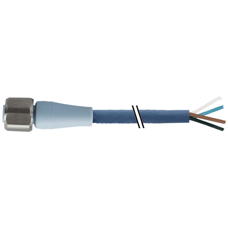 Connecteur / Câble de raccordement; Type: Câble de connexion, M12 x 1, surmoulé; Type de signal: Capteur / Actionneur; Raccordement A: Connecteur M12, femelle, droit, 4 pôles, codé A; Raccordement B: Extrémité de câble libre; Câble: 5 m, 4 fils (4 x 0,34 mm²), TPE-S, sans halogène, bleu; Blindage: Non blindé; Compatible chaîne porte-câble: Oui; Matériau de l'écrou-raccord: Acier inoxydable (V4A); Tension de service: max. 250 V AC/DC; Tension de service (UL listed): 30 V AC/DC; Charge électrique: 4 A; Indice de protection: IP65, IP68, IP69K; Température de service: - En mouvement: - 25 ...+ 105 °C, - En position fixe: - 25 ...+ 85 °C, - Câble : Plage de température (fixe): - 40 ...+ 105 °C