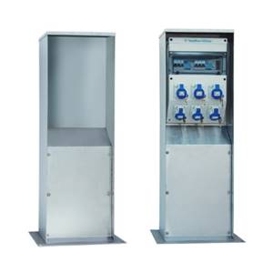 Borne pour camping BC2 équipée de :1 Borne en polycarbonate beige avec diffuseur non équipé, dim: H1147xL310xP310mm avec1 Fenêtre 8 modules1 Alimentation sur bornier doublé 3P+N+T 16 - 25 mm²4 Socles de tableau CEEtyp IP44 inclinés 2P+T 16A 230V protégés par4 disjoncteurs différentiels P+N C 16A 30mA1...