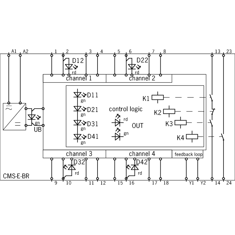 Analyseur CMS-E-BR; Nombre de têtes de lecture: Jusqu’à 4 têtes de lecture ; Contact de sécurité: 1; Contact auxiliaire: 1; Boucle de retour raccordable: 1; Type de connexion: Bornes de raccordement enfichables ; Tension de service: 24 V AC/DC (-10% ... +10%); Matériau du boîtier: Polycarbonate (PC) ; Type de montage: Rail normalisé TH 35 (EN IEC 60715); Indice de protection: Bornes IP20 / boîtier IP40; Température ambiante: 0 ... +50 °C; Surveillance de la position du protecteur: - Catégorie 4/PL e avec 1 seule tête de lecture raccordée, - Catégorie max. 3/PL d avec plus de 1 tête de lecture raccordée; Série: CMS