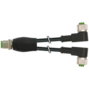 Câble de connexion, en Y; Connecteur M12-A mâle droit / 2x Connecteurs M12-A femelle coudé LED; Câble PVC 3x0,34 Noir 0,3m