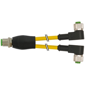 Câble de connexion, en Y; Connecteur M12-A mâle droit / 2x Connecteurs M12-A femelle coudé LED; Câble PVC 3x0,34 Jaune 0,3m