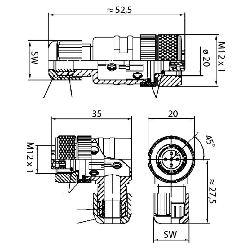 Connecteur / Câble de raccordement; Type: Connecteur confectionnable, M8 x 1; Raccordement A: Connecteur M8, mâle, droit, 4 pôles, codé-A; Raccordement B: Bornes à ressort (x4); Section des conducteurs: 0,25 mm²... 0,5 mm²; Section des conducteurs AWG: AWG 24 ... 20; Diamètre extérieur du câble: 2,5 mm...5 mm ±0,2 mm; Corps de poignée: Noir; Tension de mesure: max. 30 V; Charge électrique (40°C): 4 A; Classe de protection: IP67; Température de fonctionnement: -25 °C ... 80 °C