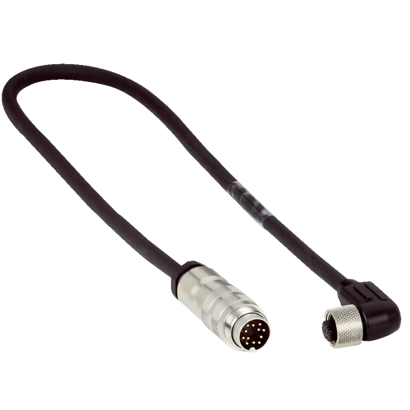 Connecteur / Câble de raccordement; Type: Câble de connexion; Raccordement A: Connecteur M12, femelle, 8 pôles, coudé; Raccordement B: Connecteur mâle, M16, 12 pôles, droit; Câble: 0,4 m, 8 fils, PUR, sans halogène; Description: RS-422, SSI, blindé