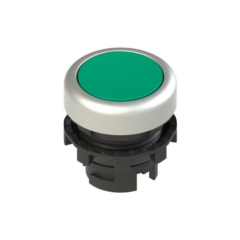 Bouton-poussoir lumineux affleurant, vert; Bague de fixation et anneau façonné: Bague en plastique; Fonction du bouton: A accrochage; Forme: Encastré Ø 20 mm; Couleur du bouton: Verrine couleur verte pour bouton affleurant et protégé; Collerette: Satin chromé; Degré de protection: IP67 selon EN 60529 et IP69K selon ISO 20653; Température ambiante: -25°C ... +50°C (standard); Série: EROUND