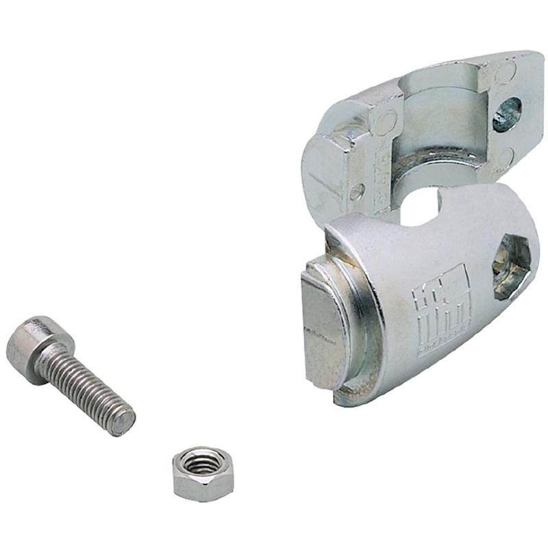 Cylindre de serrage; Type de montage: Profil rond; (Ø 12 mm); Dimensions: 27 mm x 27 mm x 37 mm; Matières: Cylindre de serrage: inox (1.4408); Fourniture: - cylindre de serrage: 1, - vis à tête cylindrique: 1 x (M5 x 16 mm), - écrous hexagonaux: 1 x M5