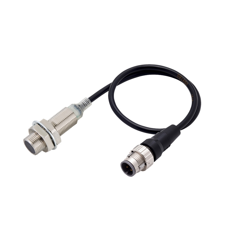 Proximity sensor, inductive, nickel-brass, short body, m12, shielded, 4 mm, dc, 2-wire, nc, no polarity, m12 pigtail connector, 0.3 m