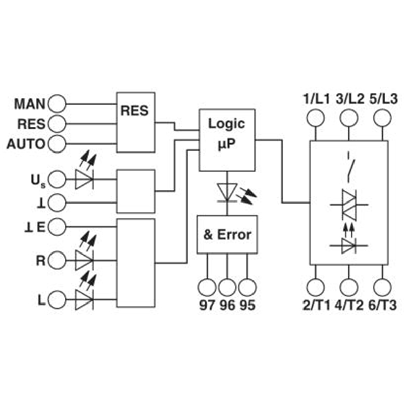 Démarreur moteur hybride pour l'inversion de moteurs AC triphasés jusqu'à 500 V AC et intensité de sortie 2,4 A avec tension de commande 24 V DC, coupure de surcharge réglable, fonction d'arrêt d'urgence jusqu'à SIL 3 / PL e et raccordement Push-in
