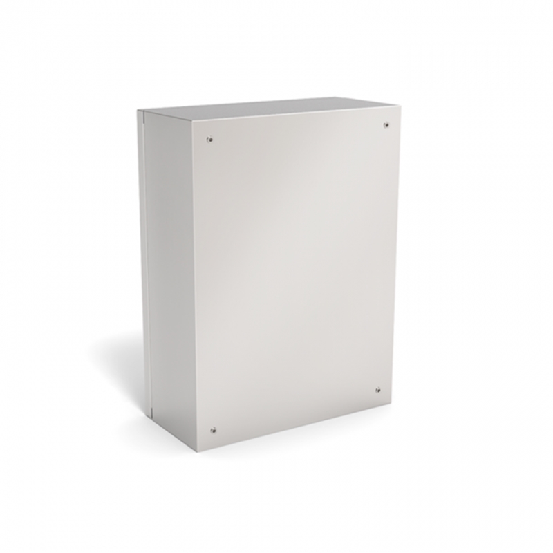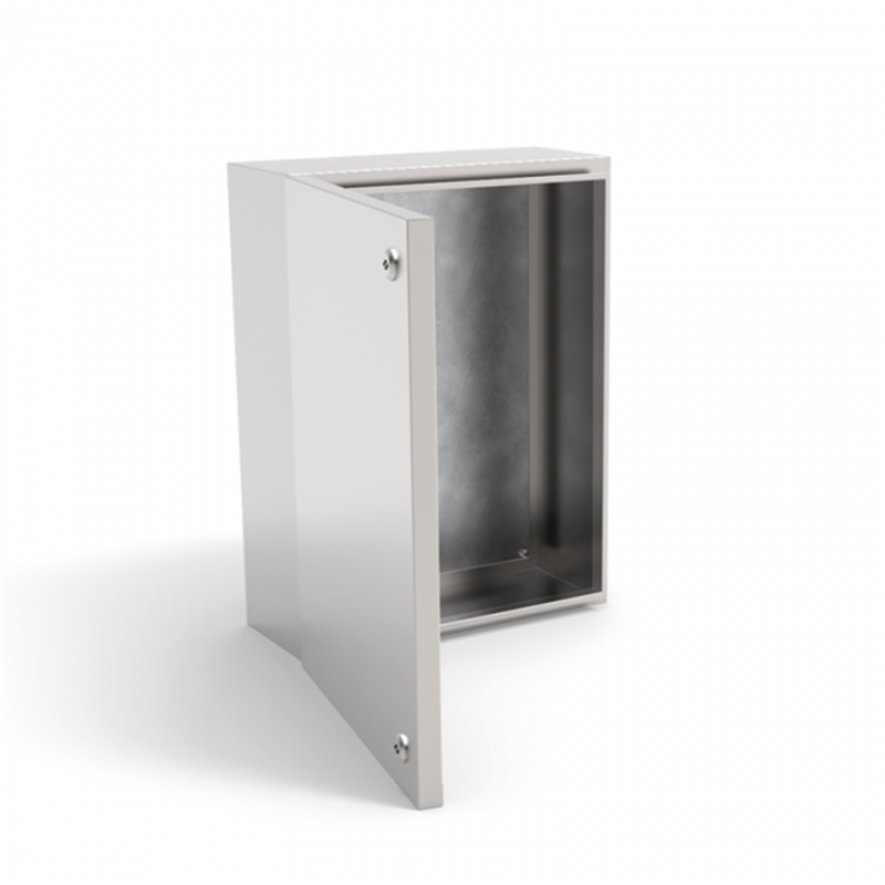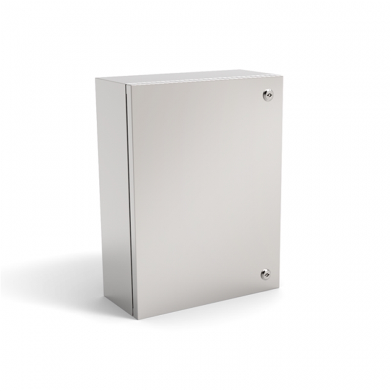 Coffret 300 450 200 (LxHxP); En acier inoxydable aisi 304 satiné brossé; Porte pleine avec charnières; Charnières en acier inoxydable; Verrouillage en acier inoxydable aisi 304 à panneton double; Fixation arrières par inserts aveugles M6; Plaque de fond Fe/Zn ep.25/10; Degré de protection IP66; Série EQ