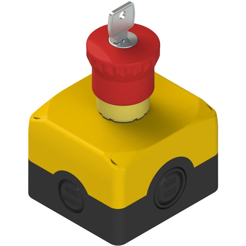 Produit complet avec boîte, bouton arrêt d'urgence et contacts; Composition: 1 bouton d’arrêt d’urgence déverrouillage par serrure, rouge - 2NC+1NO ; Série: EROUND