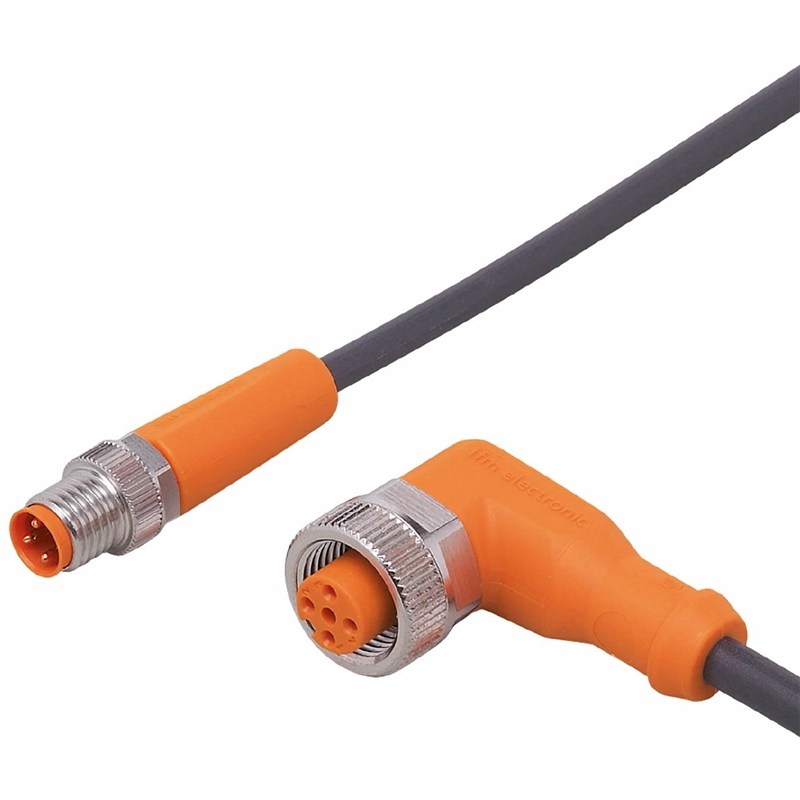 Connecteur / Câble de raccordement; Type: Câble de connexion, M12 x 1 / M8 x 1; Raccordement A: Connecteur 1 x M12, femelle, coudé, 5 pôles, codé-A, Verrouillage: laiton, nickelé, Contacts: doré, Couple de serrage: 0,6...1,5 Nm; Raccordement B: Connecteur 1 x M8, mâle, droit, 3 pôles, codé-A, Verrouillage: laiton, nickelé, Contacts: doré, Couple de serrage: 0,3...0,5 Nm; Câble: 1 m, PUR, Sans halogène, noir, Ø 4,3 mm, 3 x 0,34 mm² (42 x Ø 0,1 mm ); Aptitude pour des câbles en mouvement: Oui; Tension d'alimentation: < 50 VAC / < 60 VDC; Courant de sortie total: 3 A; Indice de protection: IP 65, IP 67, IP 68, IP 69K; Température ambiante: -25...90°C; Température ambiante en mouvement: -25...90°C