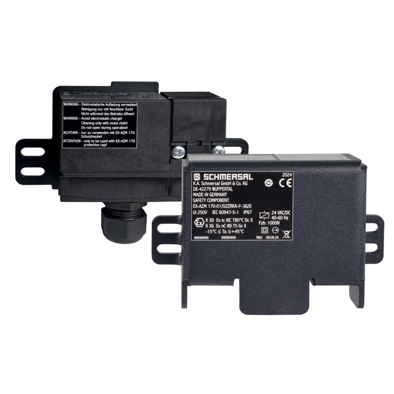 Dispositif d'interverrouillage ; Mode d’action: électromécanique; Ouverture hors tension: Oui; Déverrouillage manuel: Oui, en bas avec clef trois pans M5; Nombre de contacts de sécurité: 2; Matériau des contacts, électriques: Argent; Force de retenue: 1.000 N; Force de maintien: 30 N; Raccordement: Technique de percement d'isolant (IDC); Dimensions (L x l x H): 30 mm x 90 mm x 84 mm; Matériau du boîtier: Plastique, thermoplastique renforcé de fibres de verre; Etanchéité: IP67; Température ambiante: -15 ... +45 °C; Zone ATEX: Zone 2 et 22; Etiquetage protection antidéflagrante: Ex D II 3G Ex nC IIB T5 Gc X, Ex D II 3D Ex tc IIIC T80°C Dc X; Série: EX-AZM 170