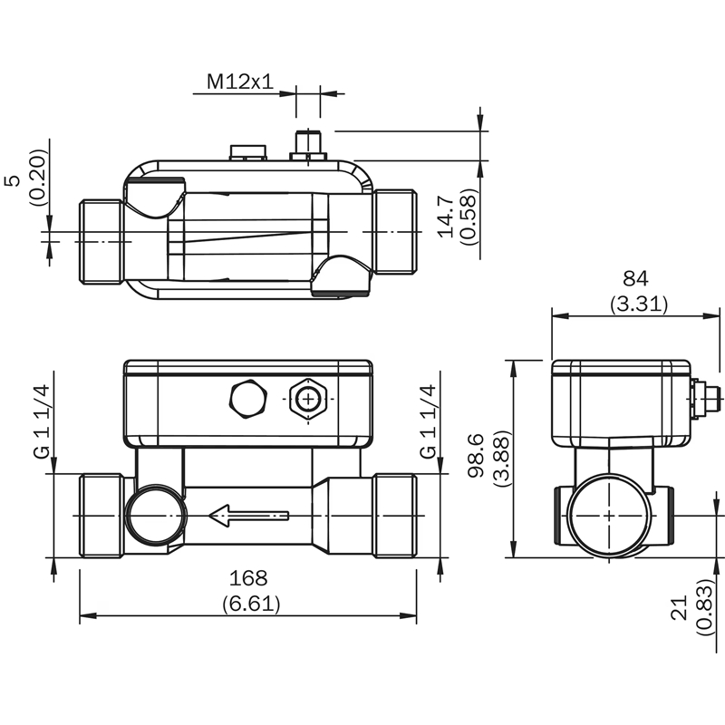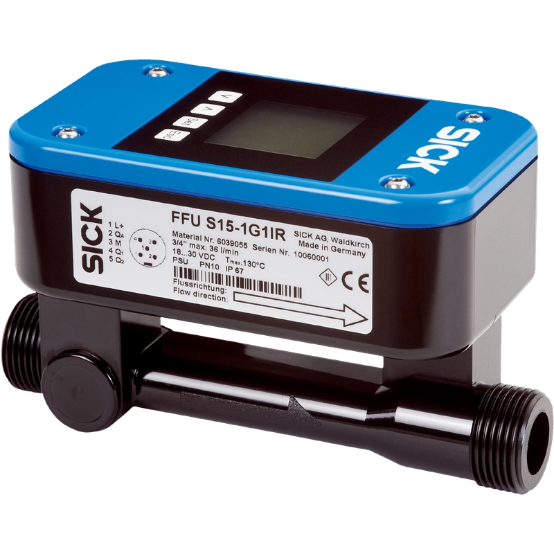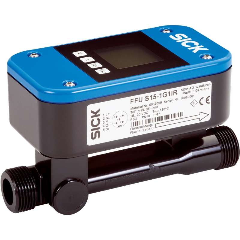Capteur de débit; Diamètre nominal du tube de mesure: DN 25; Débit maximal: max. 240 l/min; Matériaux en contact avec la matière: PPSU; Raccord process: G 1 ¼; Signal de sortie: Sortie analogique 4 mA ... 20 mA, 0 mA ... 20 mA pour le débit et la température actuels, 2 sorties d'impulsion/d'état sortie transistor pour comptage de quantité, surveillance de tuyaux vides, valeur limite de débit, 1 entrée de commutation pour le dosage, la réinitialisation de la quantité; Température de process: 0 °C ... +80 °C; Pression du process: Max. 10 bar; Précision de l'élément de mesure: 1 % (de la valeur de mesure ± 3 mm / s (avec protocole de calibrage)); Série: FFU