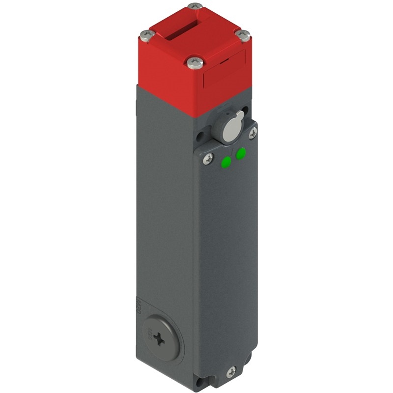 Interrupteur de sécurité à actionneur séparé avec verrouillage; Boîtier: Boîtier en métal, trois entrées câbles filetés M20x1,5; Principe de fonctionnement: Principe E, actionneur verrouillé avec électroaimant excité; Blocs de contact: 2NC (déplacés par l'actionneur) et 2NC (déplacés par l'électroaimant); Ouverture positive: Oui; Tête: Tête orientable; Alimentation: 24 Vac/dc; LED: Deux LED verts allumés par l'alimentation de l'électroaimant; Actionneur: Sans actionneur; Type de contacts: Contacts en argent; Presse-étoupes ou connecteurs pré-installés: Aucun; Degré de protection: IP67 selon EN 60529; Température ambiante: 40°C ... +60°C; Série: FG
