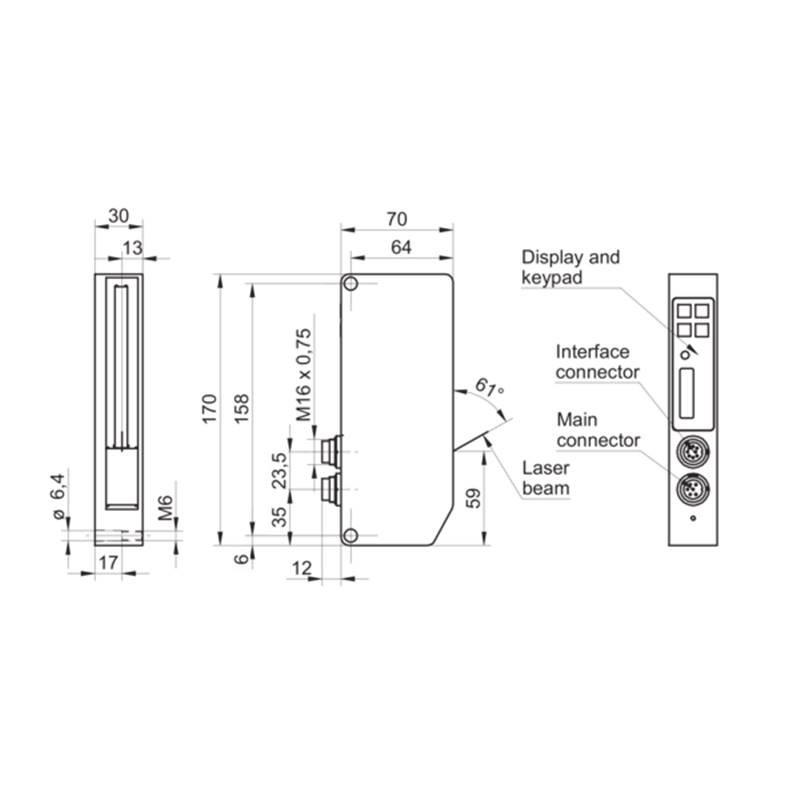 Compteur laser d'exemplaires Scatec 15; Format: Parallélépipédique; Distance de mesure Sd: 0 ... 120 mm; Distance de travail optimale: 100 mm; Vitesse de comptage: < 3000000 Exemplaires/h; Sensibilité: Feuille détachée/épaisseur bord 0,15 mm; Source d'émission: Laser, Lumière rouge visible, Classe 2; Point de mesure: Ligne rouge laser 8 mm visible; Sortie de commutation: Opto-isolé collecteur ouvert; Interface de communication: Série pour ScaDiag software; Raccordement: Connecteur DIN 45322, 6-pôles; Tension d'alimentation: 10-30Vdc; Matériau du boîtier: Zinc moulé sous pression; Dimensions: 30 mm x 170 mm x 70 mm; Indice de protection: IP54; Température de fonctionnement: 0 ... +50 °C
