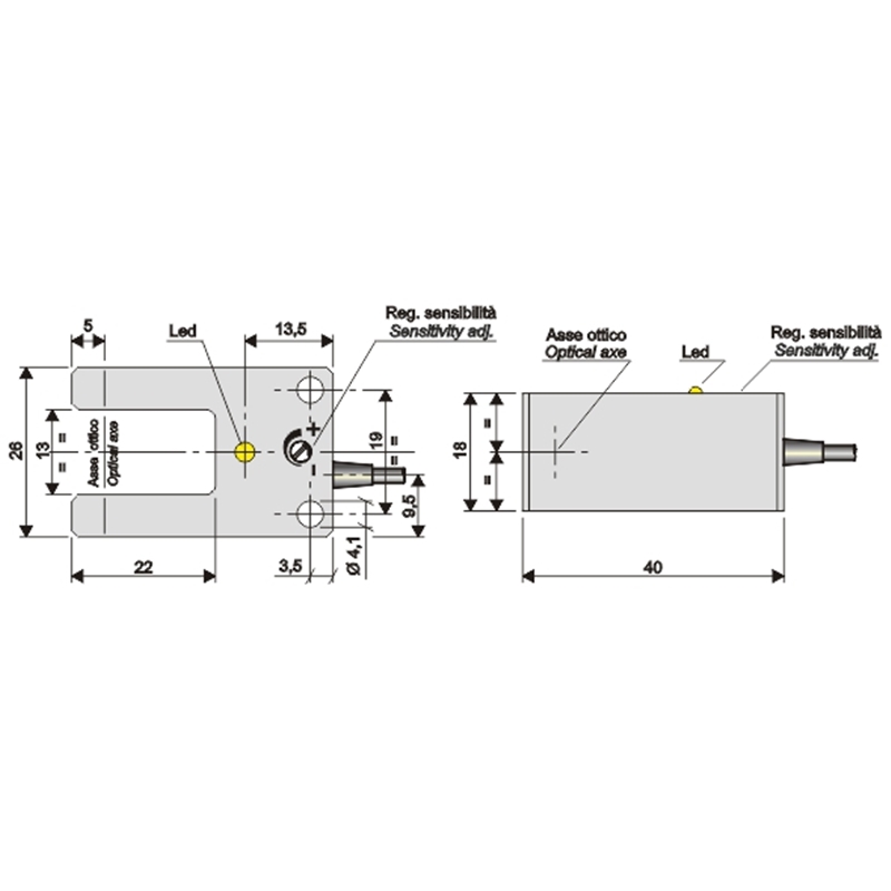 Fourche optique; Format : Fourche en U; Principe du capteur : Barrière; Principe de détection : Émetteur-récepteur; Ecartement de la fourche : 13 mm; Profondeur de la fourche : 22 mm; Réglage : Potentiomètre; Source d'émission : LED, Lumière infrarouge; Sortie de commutation : PNP; Type de commutation : Contact à fermeture (NO); Fréquence de commutation : 500 Hz; Temps de réponse : 75 ms; Raccordement : Câble 2 m, 3x0.25, PVC; Tension d'alimentation : 10-30Vdc; Dimensions (l x H x P) : 26 mm x 40 mm x 18 mm; Matériau du boîtier : Laiton nickelé; Indice de protection : IP67; Température de fonctionnement : –25 °C ... +50 °C; Série : FT13