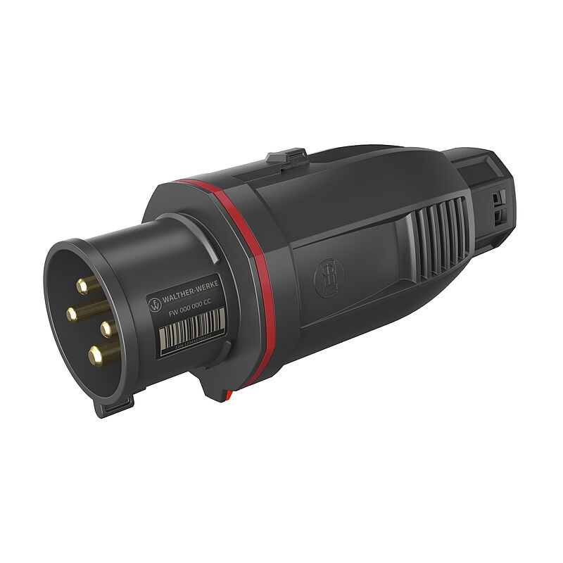 Fiche One-Touch WALTHER CEE NEO avec cages à ressort 32A 4P 6h IP54 200/346 V - 240/415 V~ avec codage par anneau de couleur « rouge ». Boîtier en PA6 avec porte-contacts haute résistance à la chaleur en PA66 et serre-câble à activation automatique