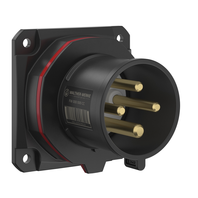 Socle connecteur mural droit WALTHER CEE NEO avec cages à ressort 32A 4P 6h IP54 200/346V - 240/415V~ avec code couleur "rouge". Boîtier en PA6 avec support de contact très résistant à la chaleur en PA66. Protection contre les contacts directs selon BGV A3. Dimensions de la bride 86x86mm. Dimensions de montage 69.5x69.5mm