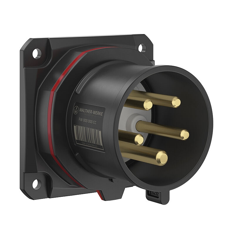 Socle connecteur mural droit WALTHER CEE NEO avec connexion par vis 32A 5P 6h IP54 200/346V - 240/415V~ avec inverseur de phase, code couleur "rouge". Boîtier en PA6 avec support de contact très résistant à la chaleur en PA66. Protection contre les contacts directs selon BGV A3. Dimensions de la bride 86x86mm. Dimensions de montage 69.5x69.5mm