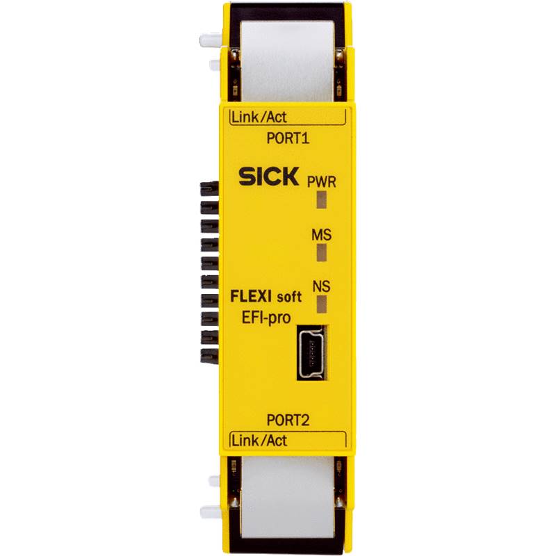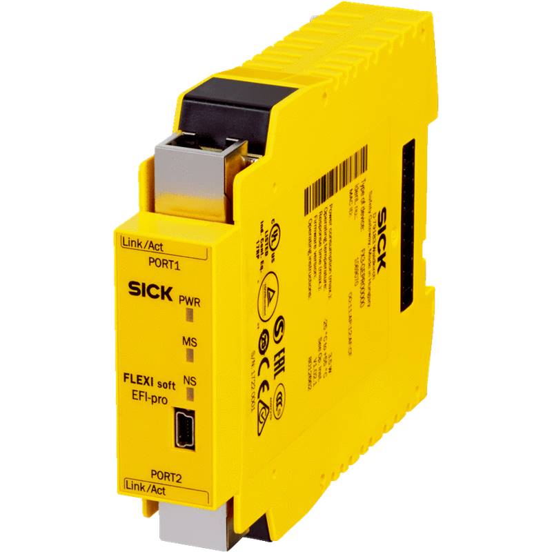 Système de commande de sécurité; Module: Passerelle; Bus de terrain, réseau industriel: EFI-pro, EtherNet/IP™ CIP Safety™; Type de configuration: Par logiciel (Safety Designer); Switch Ethernet intégré: 3 switches-port layer-2 avec Auto-MDI-X pour la détection automatique de câbles, Ethernet croisés; Raccordement: 2 connecteurs femelles, RJ-45; Alimentation électrique: Par FLEXBUS+; Dimensions (l x H x P): 22,5 mm x 96,5 mm x 120,6 mm; Indice de protection: IP20 (EN 60529); Température de service: –25 °C ... +55 °C; Série: Flexi Soft