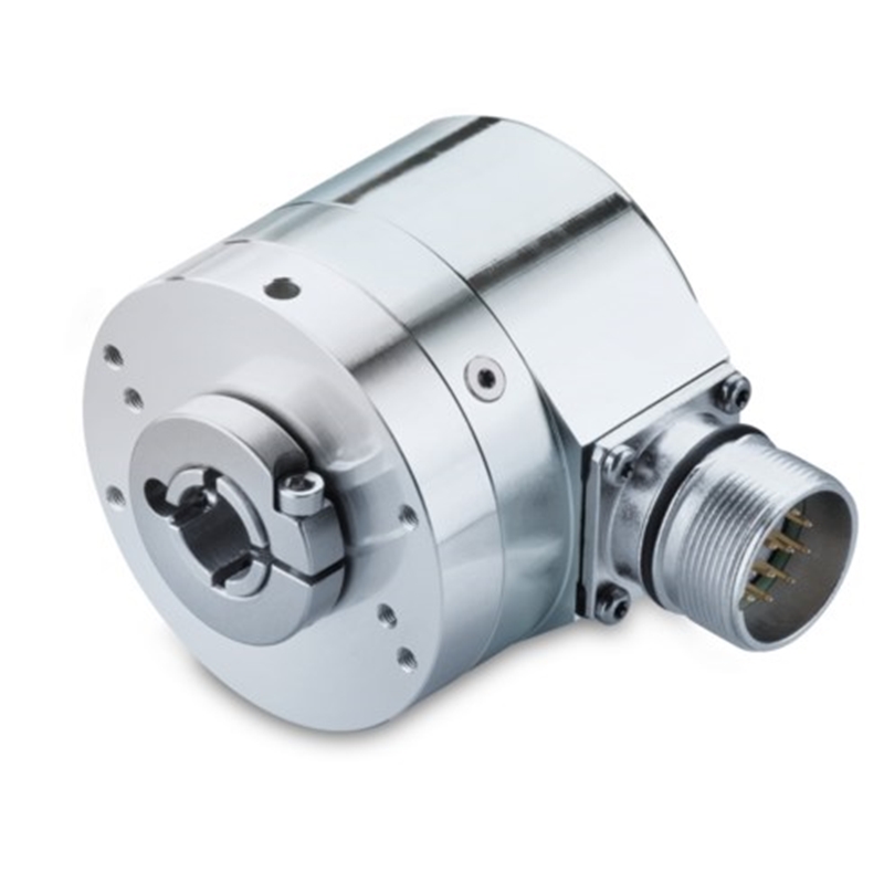 Codeur absolu à sortie série SSI, multitour, Ø58 mm à axe creux traversant, alésage Ø14 mm, IP54, bague de serrage, résolution 25 bits: ST 13 bits et MT 12 bits, code Gray, alimentation 10-30 VDC, embase radiale mâle M23 à 12 contacts en sens horaire