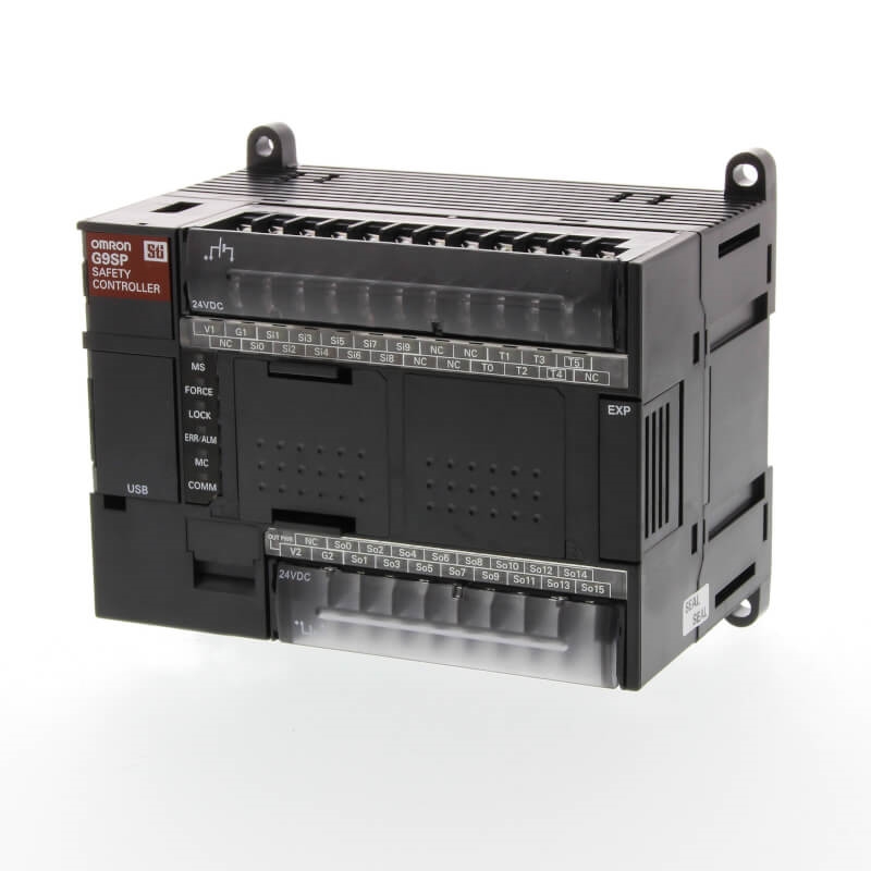 Contrôleur de sécurité programmable autonome, 20 entrées (PNP), 8 sorties (PNP), 6 sorties test, 128 blocs de fonction, Borniers débrochables, Carte de communication optionnelle : RS232 ou EIP, Slot pour carte mémoire de sauvegarde/restauration, Extensions possible avec E/S standards, SIL3 / PLe