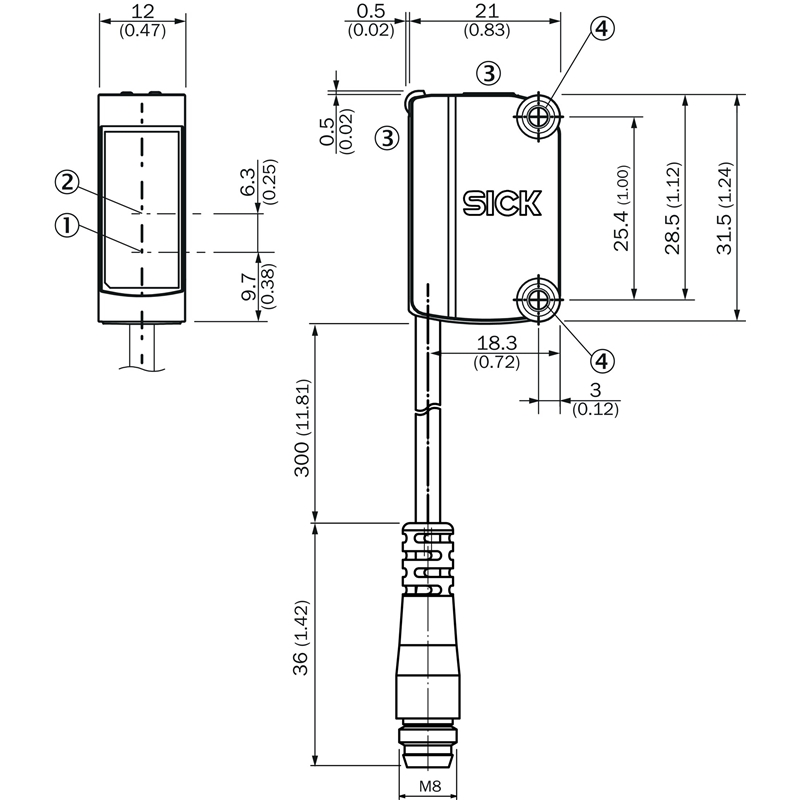 Capteur photoélectrique; Format: Parallélépipédique; Principe du capteur: Barrière réflex; Distance de commutation: 0,08 m ... 12 m (P250F); Réglage: Potentiomètre; Source d'émission: Laser, Lumière rouge visible, Polarisée; Taille du spot lumineux (distance): Ø 3,5 mm (1.000 mm); Sortie de commutation: NPN; Type de commutation: Commutation claire/sombre; Temps de réponse: max. 625 µs; Fréquence de commutation: 1.000 Hz; Raccordement: Câble avec connecteur mâle M8, 4 pôles, 336 mm, PVC; Tension d’alimentation Ub: 10-30Vdc; Dimensions (l x H x P): 12 mm x 31,5 mm x 21 mm; Matériau du boîtier: Plastique, ABS; Indice de protection: IP67 (EN 60529); Température de fonctionnement: –20 °C ... +50 °C; Série: G6