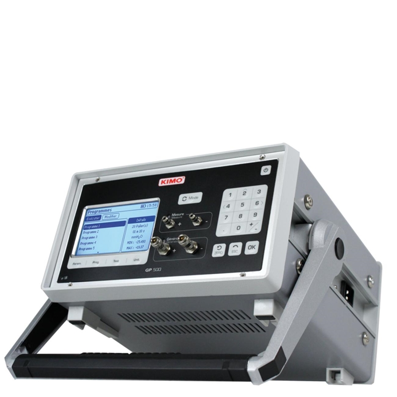 Banc d'étalonnage autonome basse pression type GP 500-2. Échelle de mesure 0 à 10 000 Pa. Résolution évolutive : 0.01 Pa de 0 à 100 Pa ; 0.1 Pa de 100 à 1000 Pa et 1 Pa au-delà. Capteur étalon avec autocalibration permanente et générateur de pression dynamique de 50 à 10 000 Pa. Afficheur LCD graphique rétro-éclairé 86x51mm. Entrée USB pour connexion PC. Raccordement pression par raccord rapide diamètre 6 mm. Alimentation secteur ou batterie (autonomie 8h). Boîtier antichoc avec poignée de transport dimension 378 x 301 x 161 mm. Livré en valise de transport avec cordon d'alimentation secteur, cordon USB, logiciel d'exploitation certificat d'étalonnage et notice d'utilisation.