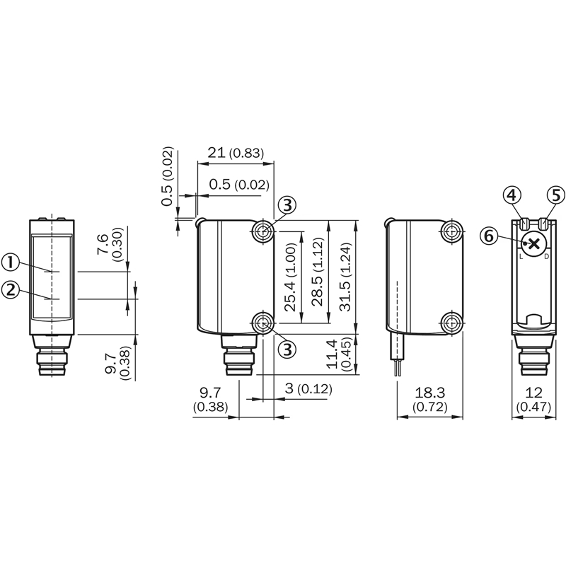 Capteur photoélectrique; Format: Parallélépipédique; Principe du capteur: Détecteur à réflexion directe; Principe de détection: Élimination d'arrière-plan; Distance de commutation max.: 5 mm ... 400 mm; Distance de commutation: 50 mm ... 220 mm; Réglage: Potentiomètre mécanique, 5 tours; Source d'émission: LED PinPoint, Lumière rouge visible; Taille du spot lumineux (distance): Ø 6 mm (100 mm); Sortie de commutation: PNP; Mode de commutation: Commutation claire/sombre; Temps de réponse: < 1,25 ms; Fréquence de commutation: 500 Hz; Raccordement: Câble avec connecteur mâle M8, 4 pôles, 239 mm, PVC; Tension d’alimentation: 10-30Vdc; Dimensions (l x H x P): 12 mm x 31,5 mm x 21 mm; Matériau du boîtier: Plastique, ABS/PC; Matériau de la vitre frontale: Plastique, PMMA; Indice de protection: IP67; Température de fonctionnement: –25 °C ... +55 °C; Série: G6