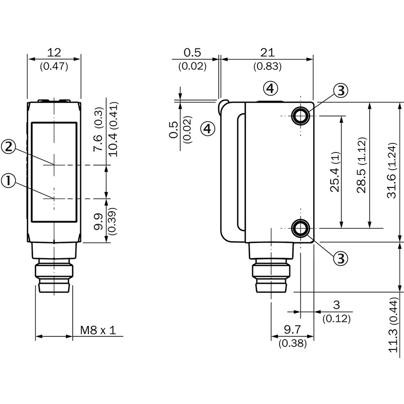 Capteur photoélectrique; Format: Parallélépipédique; Principe du capteur: Détecteur à réflexion directe; Principe de détection: Élimination d'arrière-plan; Distance de commutation max.: 5 mm ... 400 mm; Réglage: Potentiomètre, 5 tours; Source d'émission: LED PinPoint, Lumière rouge visible; Taille du spot lumineux (distance): Ø 5,6 mm (150 mm); Sortie de commutation: PNP; Mode de commutation: Commutation claire; Temps de réponse: max. 625 µs; Fréquence de commutation: 1.000 Hz; Interface de communication: -; Raccordement: Connecteur mâle M8, 4 pôles; Tension d'alimentation: 10-30Vdc; Dimensions (l x H x P): 12 mm x 31,5 mm x 21 mm; Materiau du boîtier: Plastique, ABS; Materiau de la vitre frontale: Plastique, PMMA; Indice de protection: IP67 (EN 60529); Température de fonctionnement: –30 °C ... +55 °C; Série: G6