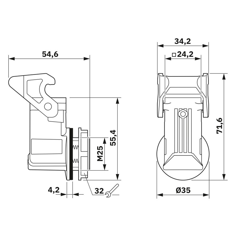 Boîtier à visser D7, avec étrier longitudinal, matériau: PA, hauteur: 41,5 mm, joint: oui, Standard, coudé, pour eléments de contact HC-A03, A04, D07, D08, Q02, Q03, Q04, Q05, Q07, Q12
