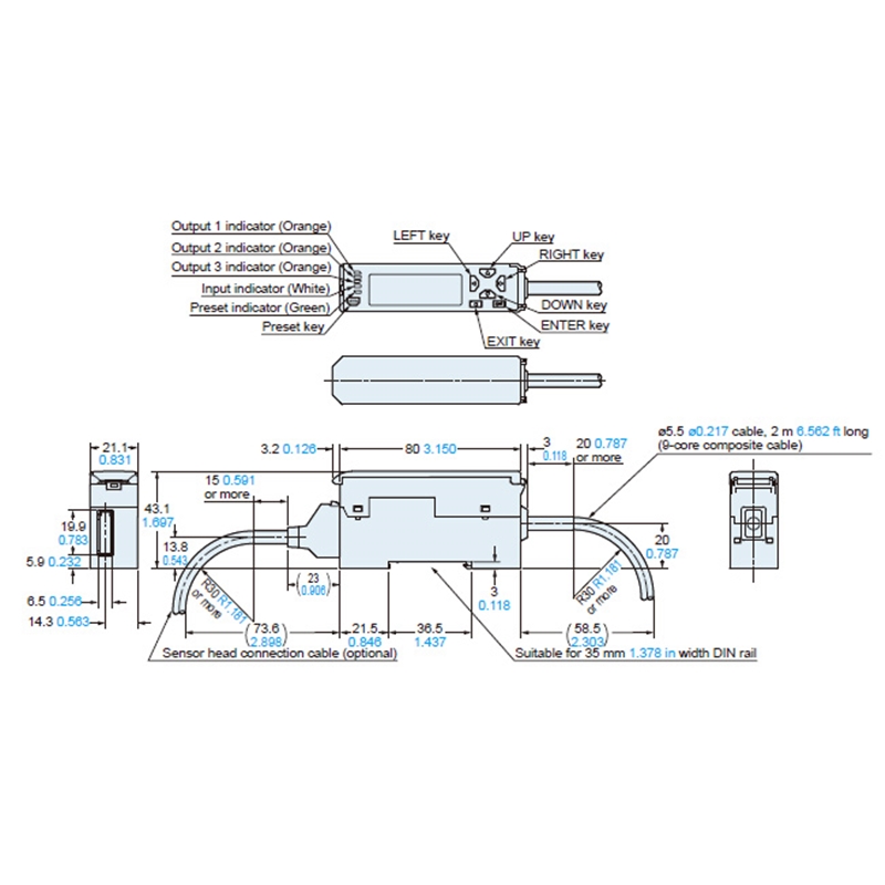 Contrôleur pour capteur barrage laser; Tête de capteur applicable: HG-T1010, HG-T1110; Version: Unité maître; Sortie de commutation: PNP; Sorie analogique: Tension, courant; Raccordement: Câbleavec connecteur; Tension d'alimentation: 24 V DC; Dimentions: 21 mm x 43 mm x 80 mm; Materiau: PC; Classe de protection: IP40; Température ambiante: -10 ... +50°C; Série: HG-T