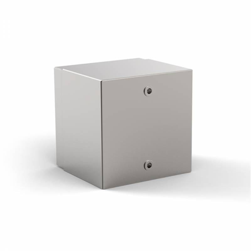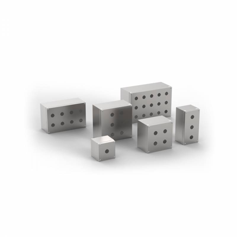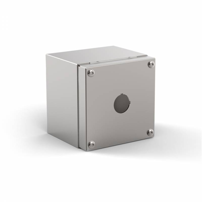 Boîte à boutons JBF 200 200 110 (LxHxP)En acier inoxydable aisi 304 satiné brosséCouvercle visséNr. 3x2 trous ø 22,5Plaque de fond en Fe/Zn ep. 2,5Degré de protection IP66