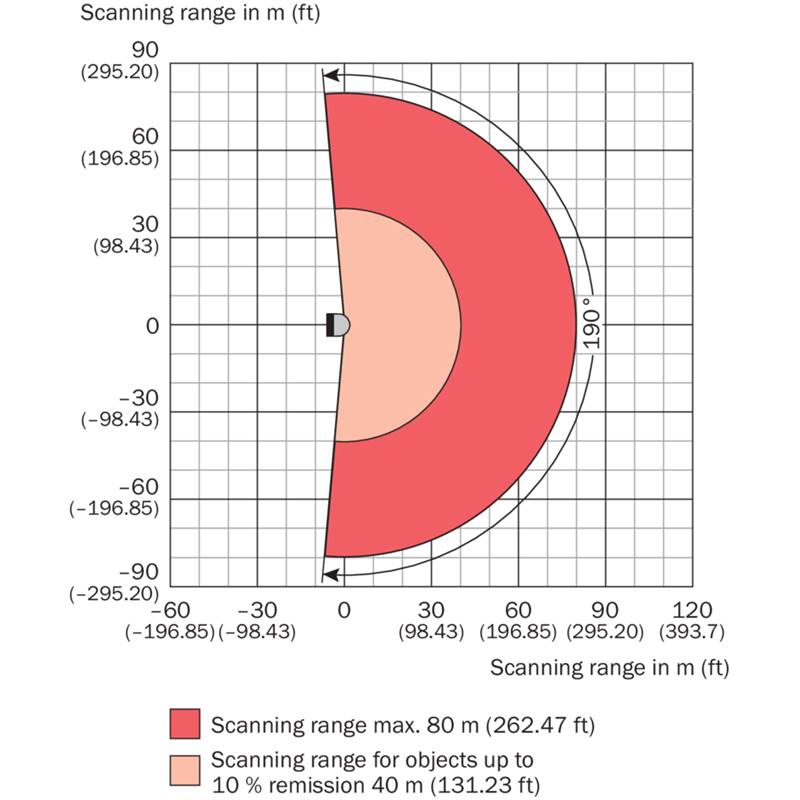 Capteur 2D-LiDAR; Application intégrée: Évaluation des champs; Zone de fonctionnement: 1 m ... 80 m; Résolutions variées: Standard Resolution; Angle d'ouverture: Horizontal (190°); Fréquence de balayage: 25 Hz / 35 Hz / 50 Hz / 75 Hz; Raccordement électrique: 4 x connecteur cylindrique M12; Indice de protection: IP65, IP67; Couleur: Gris (RAL 7032); Série: LMS5xx