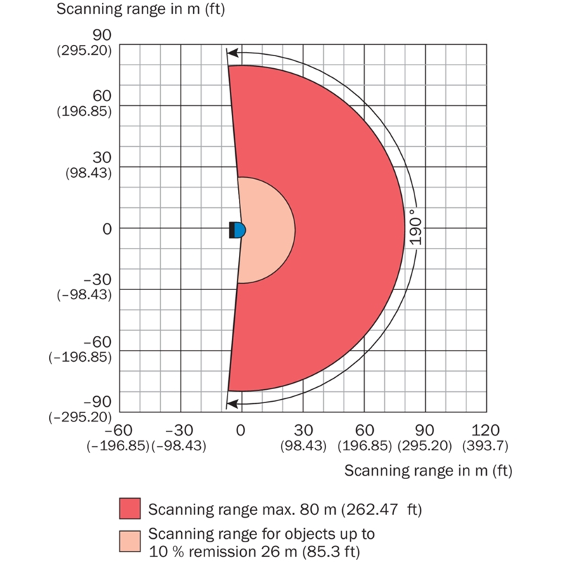 Capteur 2D-LiDAR; Application intégrée: Évaluation des champs; Zone de fonctionnement: 0,7 m ... 80 m; Résolutions variées: High Resolution; Angle d'ouverture: Horizontal (190°); Fréquence de balayage: 25 Hz / 35 Hz / 50 Hz / 75 Hz / 100 Hz; Raccordement électrique: 4 x connecteur cylindrique M12; Indice de protection: IP65, IP67; Couleur: Gris (RAL 7032); Série: LMS5xx