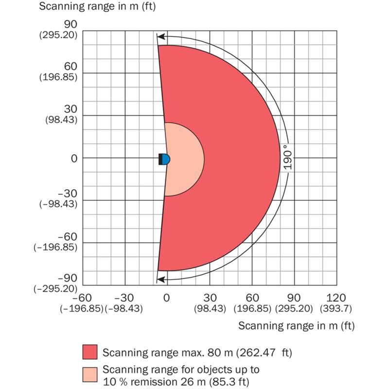 Capteur 2D-LiDAR; Application intégrée: Évaluation des champs; Zone de fonctionnement: 0,7 m ... 80 m; Résolutions variées: High Resolution; Angle d'ouverture: Horizontal (190°); Fréquence de balayage: 25 Hz / 35 Hz / 50 Hz / 75 Hz; Raccordement électrique: 4 x connecteur cylindrique M12; Indice de protection: IP65, IP67; Couleur: Gris (RAL 7032); Série: LMS5xx / Outdoor