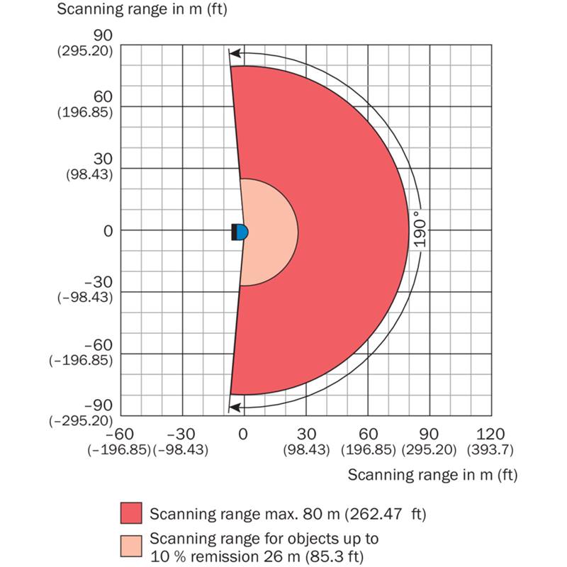 Capteur 2D-LiDAR; Application intégrée: Évaluation des champs; Zone de fonctionnement: 0,7 m ... 80 m; Résolutions variées: High Resolution; Angle d'ouverture: Horizontal (190°); Fréquence de balayage: 25 Hz / 35 Hz / 50 Hz / 75 Hz / 100 Hz; Raccordement électrique: 4 x connecteur cylindrique M12 (acier inoxydable); Indice de protection: IP65, IP67; Couleur: Gris (RAL 7032); Série: LMS5xx / Outdoor