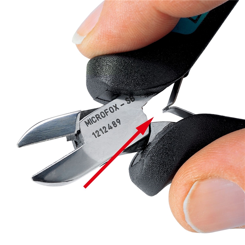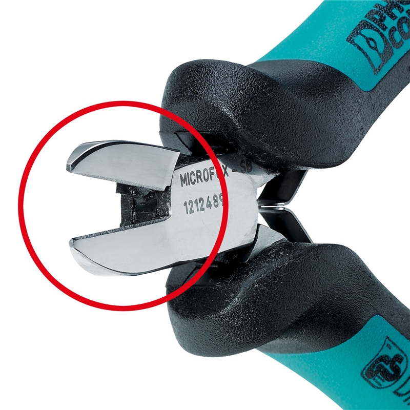 Pince coupante diagonale électronique, tête arrondie, sans chanfrein, avec ressort d'ouverture, poli miroir et huilée, poignée à 2 éléments, capacité de coupe : souple 0,2 - 2,0 mm , dureté moyenne 1,2 mm , dur 0,5 mm de diamètre