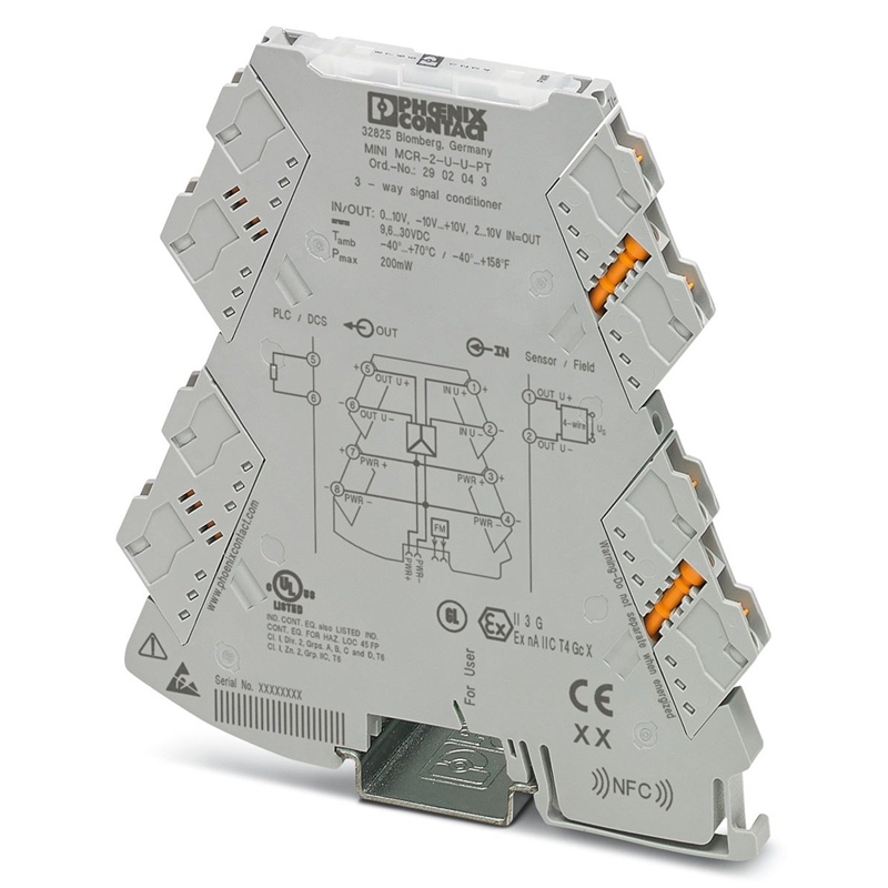 Amplificateur-séparateur MINI MCR Pro à 3 voies avec connectique enfichable pour l'isolation galvanique de signaux analogiques unipolaires et bipolaires. Signal d'entrée : 0 V ... 10 V/±10 V, signal de sortie : 0 V ... 10 V/±10 V, connectique Push-in.