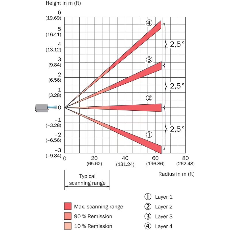 Capteur 3D-LiDAR; Domaine d’application: Outdoor; Application intégrée: Évaluation des champs intégrée avec champs flexibles sur 4 niveaux, Émission de données; Zone de fonctionnement: 0,2 m ... 64 m; Portée: À 90 % de rémission 16 m ... 30 m; Angle d'ouverture: Horizontal (275°), Vertical(e) (7,5°), sur 4 niveaux de mesure; Nombre d'échos évalués: 3; Nombre de jeux de champs: Jusqu’à 64 champs; Fréquence de balayage: 50 Hz, 4 x 12,5 Hz; Indice de protection: IP65, IP67; Poids: 1,6 kg; Série: MRS1000