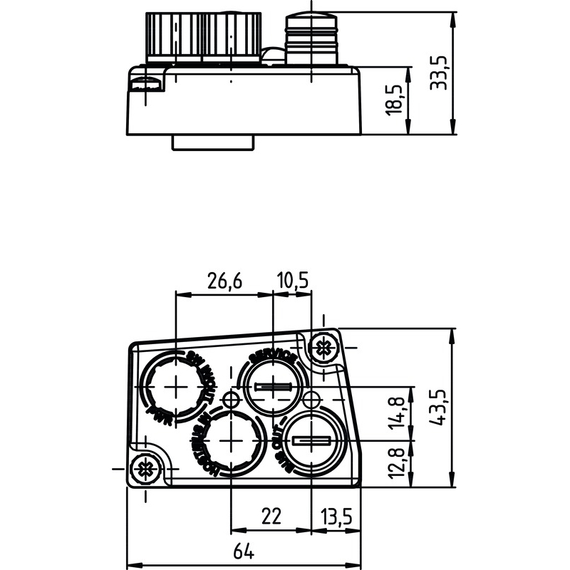 Bloc de raccordement; Adapté pour: BCL 348i, BPS 348i; Tension d'alimentation Un: 18 ... 30 VDC; Interface: PROFINET, PROFINET; Interface de maintenance: USB 2.0; Connexions: - PWR / SW IN/OUT: M12, mâle, 5 pôles, codé-A, - Interface de maintenance: USB 2.0 Mini-B, - HÔTE/BUS IN: M12, femelle, 4 pôles, codé-D, - BUS OUT: M12, femelle, 4 pôles, codé-D; Dimensions (l x H x L): 64 mm x 33,5 mm x 43,5 mm; Matériau du boîtier: Métallique, Aluminium; Indice de protection: IP 65; Température ambiante, stockage: 0 ... 40 °C
