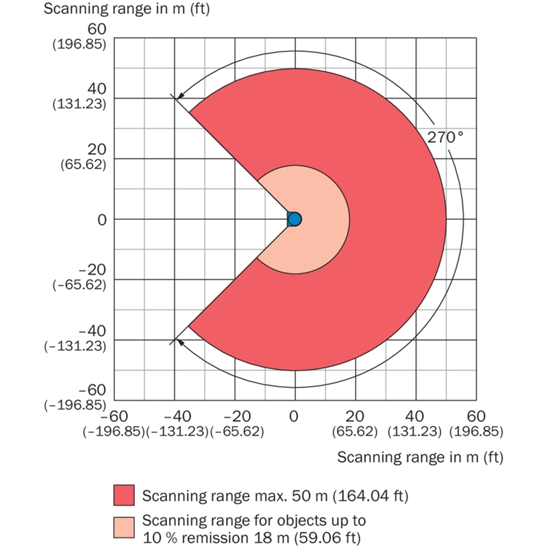 Capteur 2D-LiDAR; Domaine d’application: Outdoor; Zone de fonctionnement: 0,5 m ... 50 m, 30 m sur réflecteurs; Angle d'ouverture: 270° (Horizontal); Fréquence de balayage: max. 25 Hz; Interfaces: Ethernet TCP/IP, Série RS-232; Raccordement: 4 x connecteur mâle/femelle M12; Dimensions (L x l x H): 124,9 mm x 102 mm x 163 mm; Boîtier: Aluminium moulé sous pression; Couleur: Bleu clair (RAL 5012); Indice de protection: IP67; Série: NAV2xx