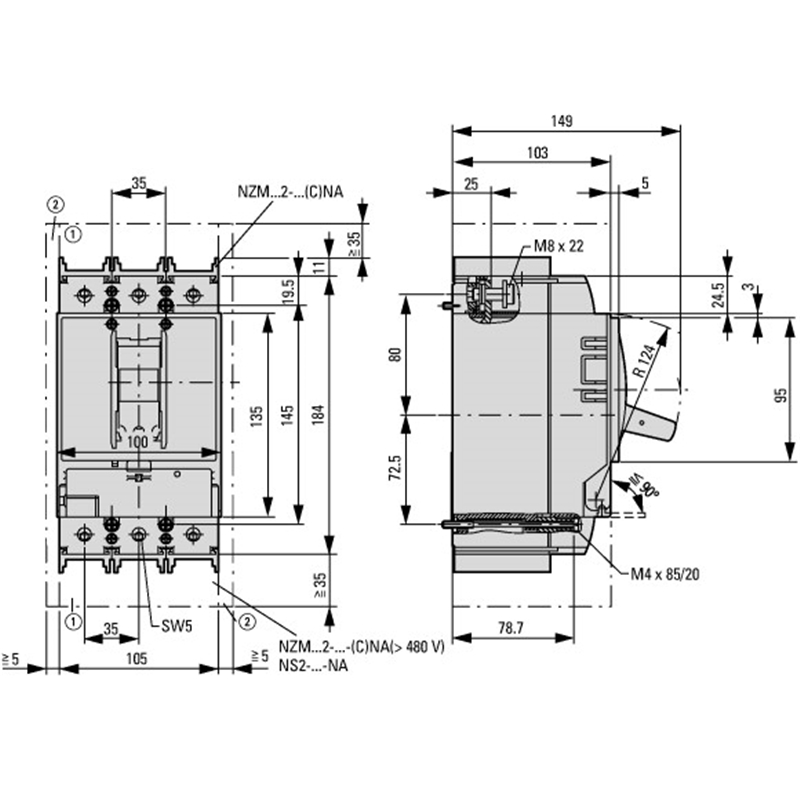 Disjoncteur NZM2, tripolaire, Pouvoir de coupure 400/415 V 50 Hz( Icu ): 50 kA, Courant assigné = courant assigné ininterrompu Courant assigné d'emploi = courant assigné ininterrompu( In = Iu ): 160 A, Technique de montage: Appareils fixes, Borne à boulon, norme / homologation: IEC, Fonction de protection: Protection des installations et des conducteurs