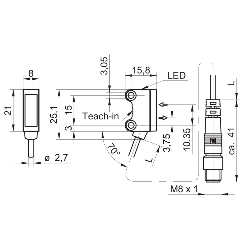 Capteur photoélectrique; Format: Parallélépipédique; Principe du capteur: Détecteur à réflexion directe; Principe de détection: Élimination d'arrière-plan; Distance de commutation max.: 20 ... 120 mm; Réglage: Teach-in et IO-Link; Source d'émission: LED PinPoint, Lumière rouge; Forme du faisceau: Ligne; Sortie de commutation: Push-pull; Mode de commutation: Commutation claire/sombre; Temps d'activation / désactivation: < 0,25 ms (High Speed Mode); Interface de communication: IO-Link V1.1, 230,4 kBaud (COM 3); Raccordement: Câble avec connecteur mâle M8, 4 pôles, 200 mm, PVC; Tension d'alimentation: 10-30Vdc; Dimensions (L x H x P): 8 x 25,1 x 15,8 mm; Matériau du boîtier: Plastique (ASA, PMMA); Face avant (optique): PMMA; Indice de protection: IP67; Température de fonctionnement: -25 ... +50 °C; Série: O200
