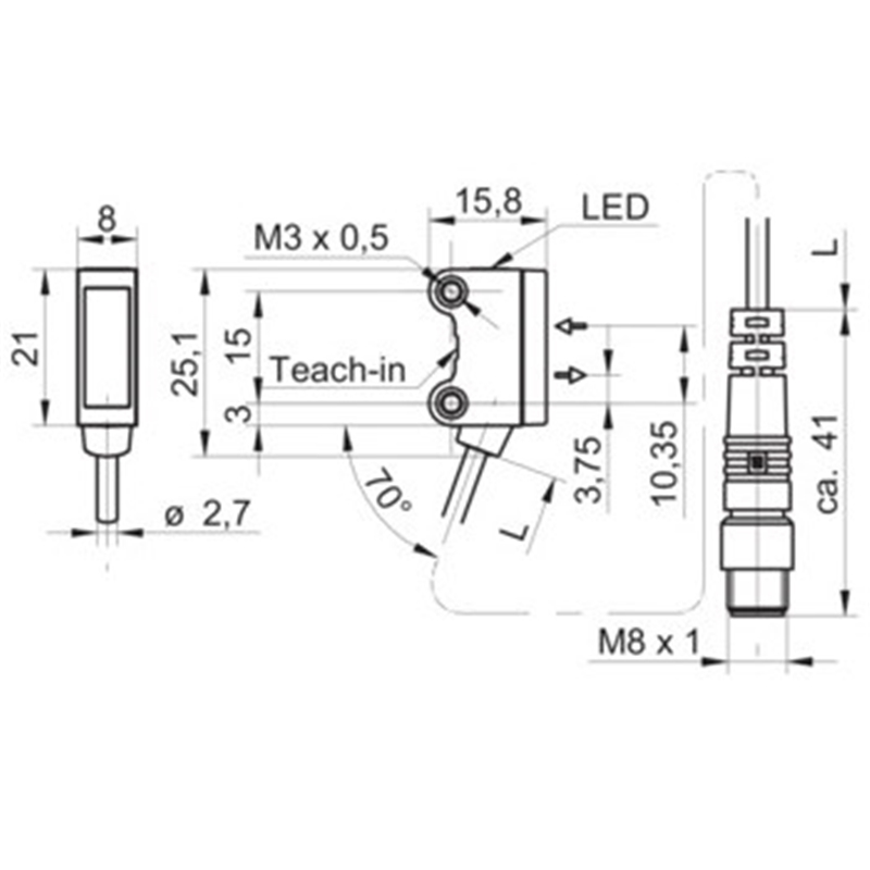 Capteur photoélectrique; Format: Parallélépipédique; Principe du capteur: Détecteur à réflexion directe; Principe de détection: Élimination d'arrière-plan; Distance de commutation: 20 … 120 mm; Réglage: qTeach; Source d'émission: LED PinPoint, Lumière rouge; Sortie de commutation: PNP complémenté; Mode de commutation: Commutation claire/sombre; Temps d'activation / désactivation: < 0,5 ms; Interface de communication: -; Raccordement: Câble avec connecteur mâle M8, 4 pôles, 200 mm, PVC; Tension d'alimentation: 10-30Vdc; Dimensions (L x H x P): 8 x 25,1 x 15,8 mm; Matériau du boîtier: Plastique (ASA, PmmA); Indice de protection: IP67; Température de fonctionnement: -25 … +50 °C; Série: O200