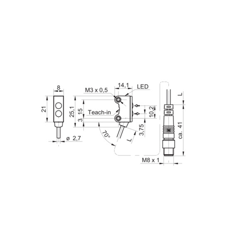 Capteur photoélectrique; Format: Parallélépipédique; Principe du capteur: Détecteur à réflexion directe; Principe de détection: Élimination d'arrière-plan; Distance de commutation: 15 … 72 mm; Réglage: Teach-in et IO-Link; Source d'émission: LED, Lumière rouge; Sortie de commutation: Push Pull; Mode de commutation: Commutation claire/sombre; Interface de communication: IO-Link V1.1, 230,4 kBaud (COM 3); Raccordement: Câble avec connecteur mâle M8, 4 pôles, 200 mm, PVC; Tension d'alimentation: 10-30Vdc; Dimensions (L x H x P): 8 x 25 x 14.1 mm; Matériau du boîtier: Plastique (ASA, PmmA); Indice de protection: IP67; Température de fonctionnement: -25 ... +50 °C; Série: O200
