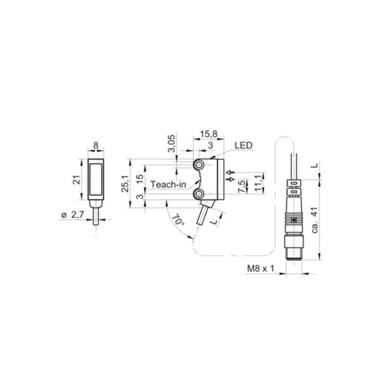 Capteur photoélectrique; Format: Parallélépipédique; Principe du capteur: Détecteur à réflexion directe; Principe de détection: Énergétique; Distance de commutation: 20 … 200 mm; Réglage: Teach-in et IO-Link; Source d'émission: LED, Lumière rouge; Sortie de commutation: Push Pull; Mode de commutation: Commutation claire/sombre; Interface de communication: IO-Link V1.1, 230,4 kBaud (COM 3); Raccordement: Câble avec connecteur mâle M8, 4 pôles, 200 mm; Tension d'alimentation: 10-30Vdc; Dimensions (L x H x P): 8 x 25 x 15.8 mm; Matériau du boîtier: Plastique (ASA, PmmA); Indice de protection: IP67; Température de fonctionnement: -25 ... +50 °C; Série: O200