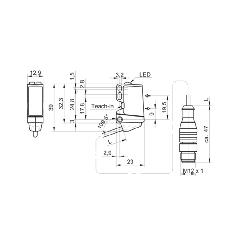 Capteur photoélectrique; Format: Parallélépipédique; Principe du capteur: Détecteur à réflexion directe; Principe de détection: Élimination d'arrière-plan; Distance de commutation max.: 300 mm; Réglage: qTeach; Source d'émission: LED, Lumière rouge; Sortie de commutation: Push-pull; Mode de commutation: Commutation claire/sombre; Interface de communication: -; Raccordement: Câble avec connecteur mâle M8, 4 pôles, 200 mm; Tension d'alimentation: 10-30Vdc; Dimensions (L x H x P): 12,9 x 32,3 x 23 mm; Matériau du boîtier: Plastique (ASA, PmmA); Indice de protection: IP67; Température de fonctionnement: -25 ... +60 °C; Série: O300